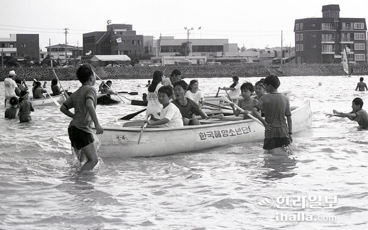 같은 해, 함덕해수욕장의 풍경입니다. 여름해양학교에 참여한 한국해양소년단 단원들이 바다에서 보트를 타고 노를 젓으며 훈련을 받고 있습니다. 훈련이라고 하기에는 아이들의 표정이 즐겁기만 합니다.