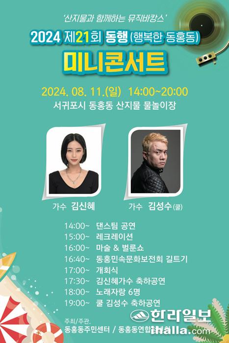 [한라일보] 제주 서귀포시 동홍동주민센터(동장 정현부)는 이달 11일 오후 2시부터 8시까지 산지물 물놀이장에서 제21회 동행(행복한 동홍동) 미니 콘서트를 연다.