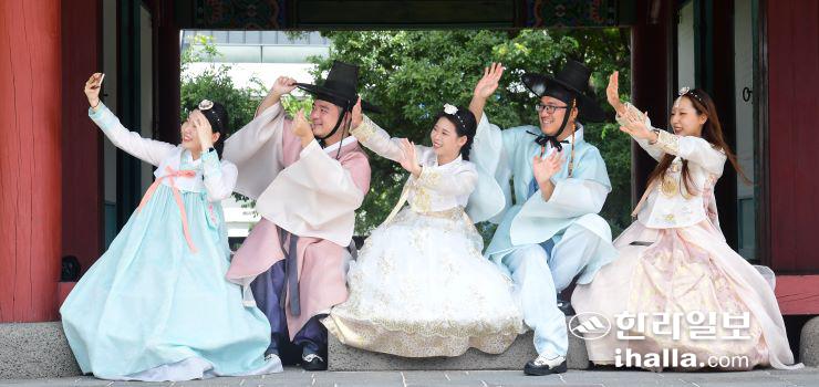 22일 중국인 대학생 여행객과 도내 대학생들이 함께 제주목관아에서 한복을 입고 사진을 찍고 있다. 이상국기자