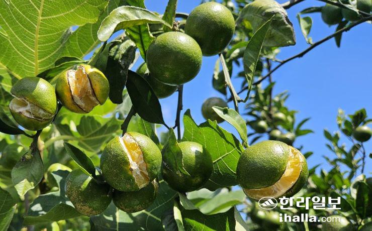 [한라일보] 폭염 일수와 연속 열대야 최장 등 각종 날씨 지표를 새로 쓴 올해 한창 비대기인 노지감귤 열매가 터지는 '열과' 발생률이 평년보다 해 농가들이 속앓이하고 있다. 지난달 21일 태풍 '종다리' 영향으로 제주에 비가 내린 후 감귤 열과 피해가 늘었지만 관수시설이 갖춰진 과원에서 지속적인 관수 외에는 열과를 막을 뚜렷한 방법도 없어서다.