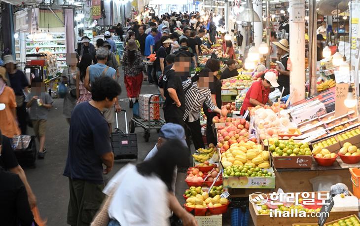 [한라일보] "추석 명절 대목이라 붐비지만 경기가 어렵다고 하고, 과일 가격 등도 올라 고객들이 지갑은 잘 열지 않네요."
