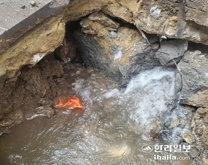 | 27일 상수도 공급이 중단된 제주시 연동 H빌딩 앞 누수 현장. 독자 제공 |