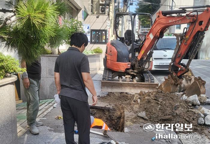 제주시가 27일 오후 누수로 수돗물 공급이 중단된 연동 H빌딩 앞에서 긴급 복구 공사를 벌이고 있다. 독자 제공