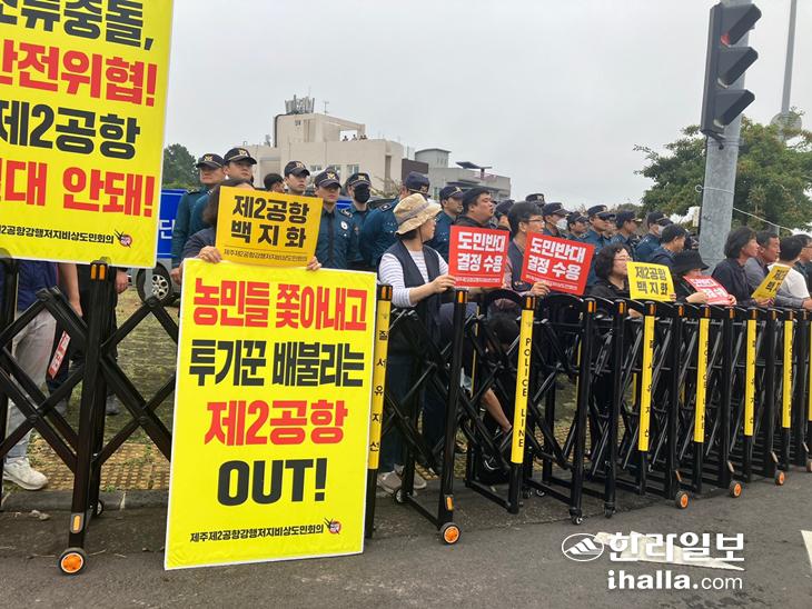 시민사회로 구성된 제주제2공항강행저지비상도민회의(비상도민회의)는 15일 제주시 영평동 제주국제자유도시개발센터 청사 앞 도로에서 기자회견을 열어 "윤석열 대통령은 제주도 민생현안인 제2공항에 대한 도민의 목소리를 들어야 한다"고 소리쳤다.