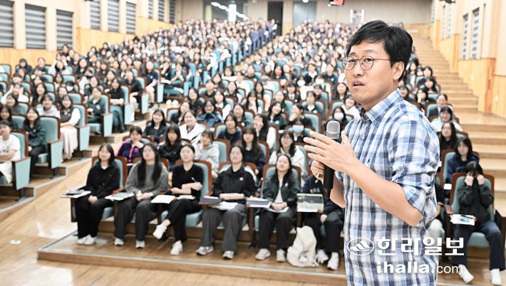 지난 14일 중앙여자고등학교 자이언트홀에서 한라일보와 제주국제자유도시개발센터(JDC)가 공동주최하는 '스타강사와 함께하는 JDC 톡 톡튀는 교육특강' 스물여덟 번째 강의가 개최됐다. 강희만기자