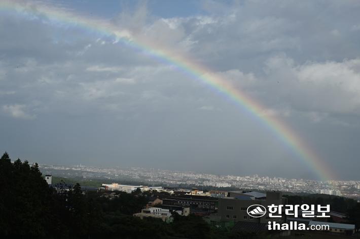 18일 저기압의 영향으로 제주지방에 비가 내리면서 제주시 아라동에 무지개가 떠올랐다. 강희만 기자