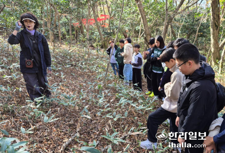 | 효돈초등학교 5학년 학생들이 19일 한라산둘레길 동백길을 걸으며 숲이 어떻게 만들어지는지에 대한 이야기를 듣고 있다. |