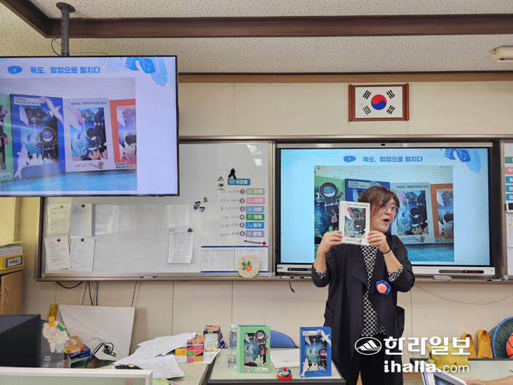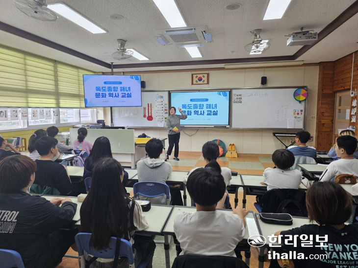 김하영 강사의 활기찬 소개와 함께, 지난 7월 첫걸음을 땐 한라일보와 제주특별자치도가 함께하는 '2024 찾아가는 독도해녀교실' 여정의 끝을 향하는 수업이 시작됐다. 독도 출향해녀 문화역사교실 수업은 지난 10월 22일 하귀초등학교 6학년 1·2반 교실에서 진행됐다.