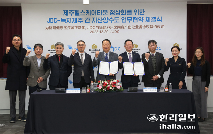 | 제주국제자유도시개발센터(이사장 양영철)와 녹지제주헬스케어타운 유한회사(대표이사 동건봉)는 2023년 12월 20일 JDC 본사에서 장기간 공사가 중단된 헬스케어타운 정상화를 위한 업무협약을 체결했다. |