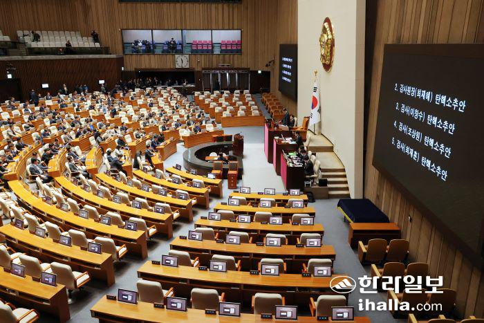 이날 본회의는 여당 의원들이 최 원장과 이 지검장 등의 탄핵에 반발해 불참하고서 규탄대회를 연 가운데 민주당 등 야당 의원들만 참여해 진행됐다.