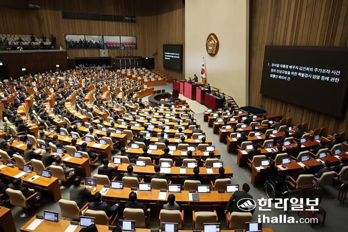 [한라일보] 국회는 7일 본회의를 열고 재석의원 300명, 찬성 198, 반대 102 표로 '김건희 여사 특검법'재의요구안을 부결시켰다.