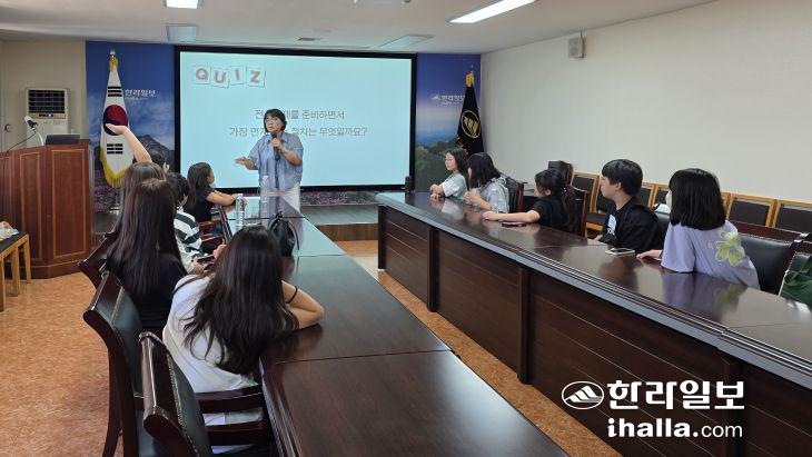 지난 26일 한라일보 3층 회의실에서 '2025 JDC와 함께하는 청소년캠프'의 첫 번째 프로그램인 1차시 수업이 열렸다. 올해 'JDC 청소년 캠프'는 제주 신화, 환경, 역사, 제주어 등 4가지 테마로 9월까지 총 4회 진행된다. 오은지기자