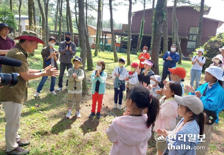 | 어린이를 대상으로 숲속에서 생태교육 중인 왕준호 대표. 왕준호 대표 제공 |