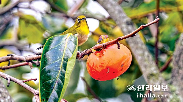 [한라일보] 완연한 가을 날씨를 보인 지난달 30일 제주시 노형동 한 가정집 정원에 동박새가 찾아와 홍시를 먹고 있다. 강희만기자