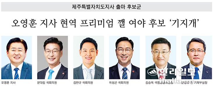 [한라일보] 내년 6월 3일 치러지는 제주특별자치도지사 선거는 현역 프리미엄을 바탕으로 재선을 노리는 오영훈 지사와 도전자들의 한 판 승부가 예상된다. 오 지사의 소속 정당인 더불어민주당 내에서 후보로 거론되는 전현직 국회의원들은 출마 여부에는 말을 아끼고 있지만 가능성을 배제하지 않고 있고, 야권은 지난 총선과 도지사 선거 출마자들이 일찌감치 출마 의향을 밝히고 본격 행보에 나섰다.