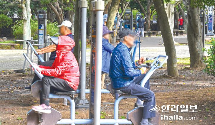[한라일보] 완연한 가을날씨를 보인 9일 제주시 신산공원을 찾은 어르신들이 기구를 이용해 운동을 하고 있다. 강희만기자