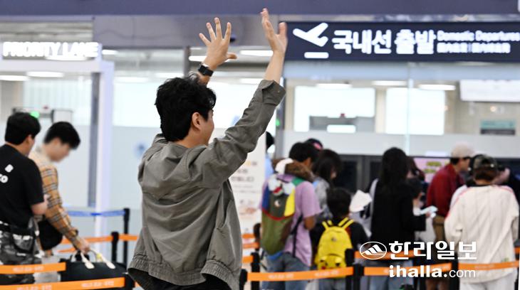 [한라일보] 민족 최대명절 추석 연휴인 지난 8일 제주국제공항에서 한 도민이 추석을 제주에서 보내고 일상으로 돌아가려는 가족들과 아쉬운 작별을 하고 있다. 강희만기자