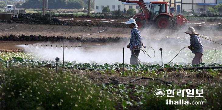 [한라일보] 12일 서귀포시 대정읍 무릉리 한 농경지에서 농민들이 병충해 농약 살포 작업을 하고 있다. 강희만기자