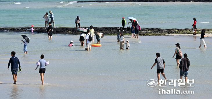 [한라일보] 늦더위가 찾아온 12일 제주시 한림읍 협재해수욕장에 많은 관광객들이 찾아 물놀이를 즐기고 있다. 강희만기자