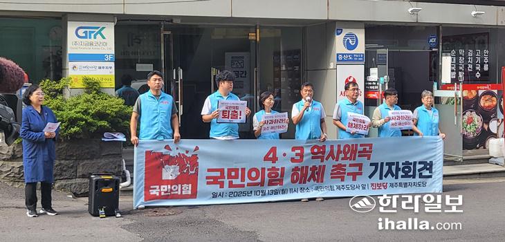 도당은 13일 제주시 연동 국민의힘 제주도당사 앞에서 기자회견을 열고 "국민의힘 제주도당만큼은 (장 대표를) 두둔하면 안됐다"며 "양민학살자를 미화하고 3만여 명의 희생자를 모욕하는 것은 민주공화국을 스스로 부정하는 역사왜곡이자 민주주의 파괴 행위와 다르지 않다"고 비판했다.