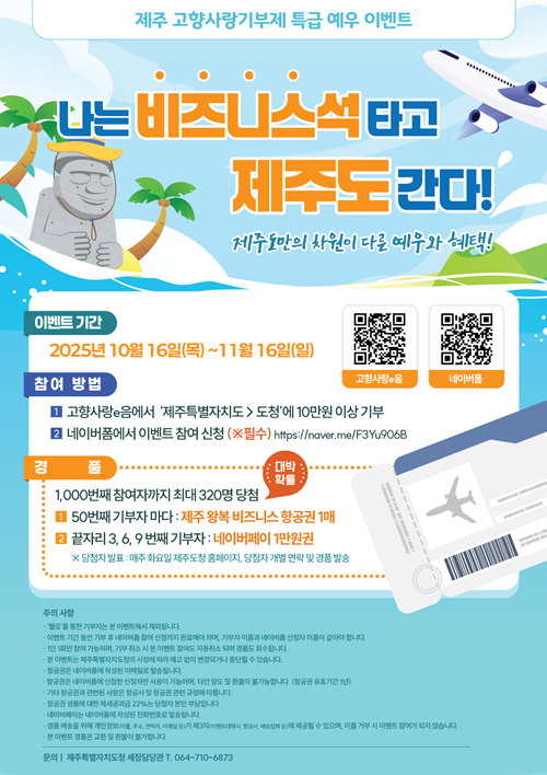 16일 제주특별자치도에 따르면 제주 고향사랑기부제 활성화를 위한 '나는 비즈니스석 타고 제주도 간다!' 행사가 다음 달 16일까지 진행된다.