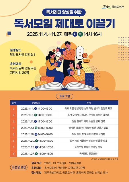 제주시 탐라도서관은 독서 리더 양성과 독서 문화 확산을 위해 '독서모임 제대로 이끌기' 강좌를 운영한다. 오는 11월 4일부터 27일까지 매주 화·목요일 오후 2시 도서관 강의실에서 진행된다.