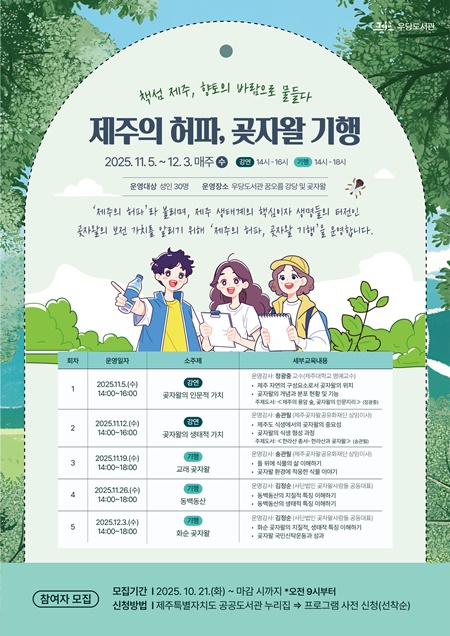 향토 독서문화진흥 사업 '책섬 제주, 향토의 바람으로 물들다'의 일환으로 진행되는 이번 프로그램은 오는 11월 5일부터 12월 3일까지 총 5차례에 걸쳐 강연과 기행으로 운영된다. '곶자왈의 인문적 가치', '곶자왈의 생태적 가치'를 주제로 한 강연 이후 교래 곶자왈, 동백동산, 화순 곶자왈 등 곶자왈 지역을 직접 탐방하는 현장 기행이 이어진다.
