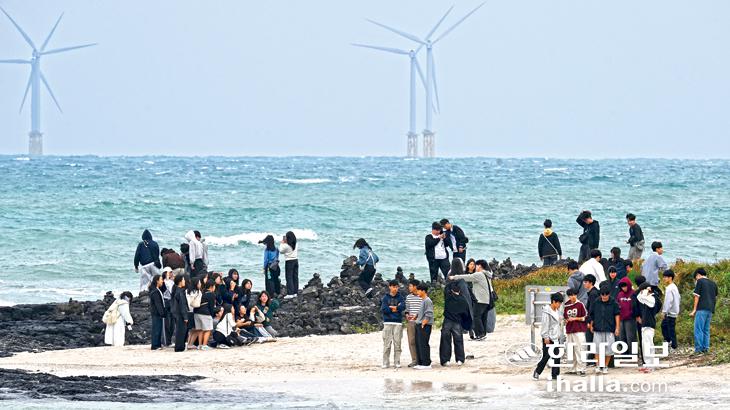 [한라일보] 21일 제주시 한림읍 협재해수욕장을 찾은 수학여행단 학생들이 제주 가을바다를 즐기고 있다. 강희만기자