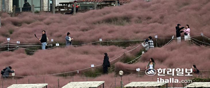 [한라일보] 21일 제주시 애월읍 새별오름 인근 한 핑크뮬리 정원을 찾은 관광객들이 사진을 찍으며 가을 정취를 만끽하고 있다. 강희만기자