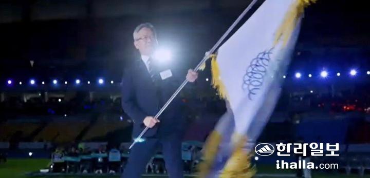 23일 제106회 전국체육대회 폐막식에서 진명기 제주자치도 행정부지사가 대회기를 인수받고 있다. 대한체육회TV 캡처