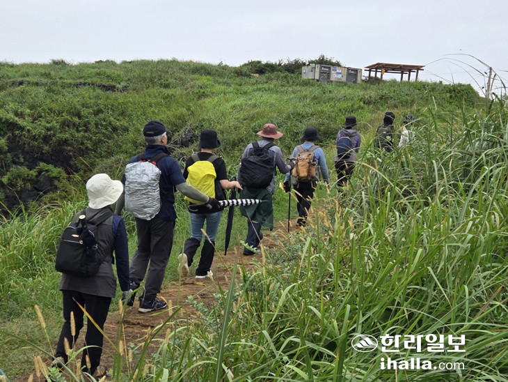 [한라일보] 가을비가 깊다. 2025년 '제주섬 글로벌 에코투어 7차'가 도심 속 공원 사라봉을 시작으로 진행됐다. 김명자 안내자는 초입에서 고르지 못한 날씨에도 참여해 준 이들에게 감사하다는 인사를 했다. 미끄럼 주의 등 안전에 심혈을 기울여주길 강조하며 오늘의 일정을 설명하고 첫발을 내딛는다. 오붓한 오솔길로 들어서니 물을 먹은 초록의 나무들이 우둑우둑 우리를 호위하듯 서 있다.