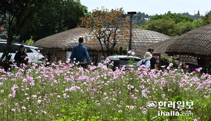 [한라일보] 23일 서귀포시 표선면 성읍민속마을 공한지에 초가를 배경으로 코스모스가 가을이 익어가고 있음을 보여주듯 만개해 관광객들의 시선을 사로잡고 있다. 강희만기자
