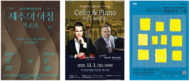 다음달 클래식 공연 여는 제주 공공 공연장. 사진 왼쪽부터 '마티네 콘서트 제주의 아침', '체코필하모닉오케스트라 첼로앤피아노 듀오 리사이틀', '타악기로 듣는 전람회의 그림' 포스터.