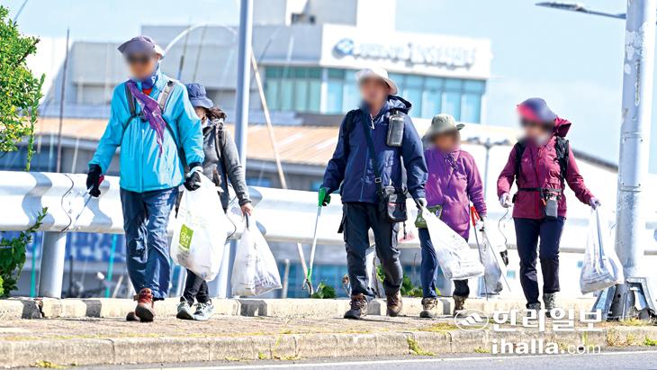 27일 서귀포시 성산읍 성산항 인근에서 올레꾼들이 플로깅을 하며 걸어가고 있다. 플로깅(plogging)은 달리기를 하면서 쓰레기를 줍는 운동으로, 이삭 등을 줍는다는 뜻의 스웨덴어 'plocka upp'과 영어의 달리기를 뜻하는 'jogging'의 합성어이다. 강희만기자