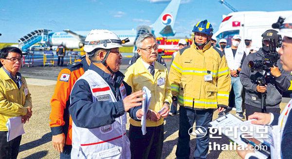 도재난안전대책본부 상황실에서 진행된 토론훈련에서는 상황 접수부터 수습까지 전 과정을 점검하고, 제주국제공항 화물청사 계류장에서는 제주시와 제주소방서, 제주지방항공청, 한국공항공사, 항공사, 조업사, 응급의료기관 등이 참여해 현장훈련을 실시했다.