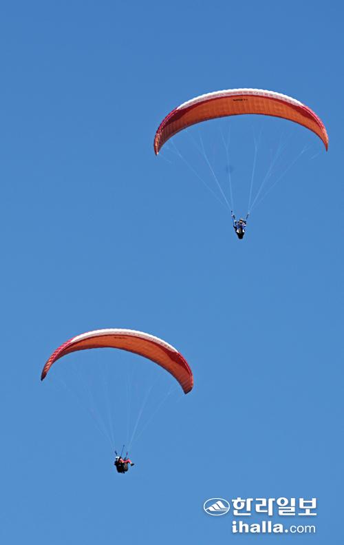 [한라일보] 29일 제주시 한림읍 금악리 금악오름 상공에서 파란 하늘을 배경으로 패러글라이딩을 즐기고 있다. 강희만기자