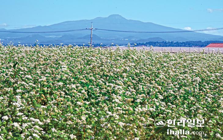 [한라일보] 29일 제주시 한경면 고산리 들판에 메밀꽃이 활짝 피어 멀리 보이는 한라산과 그림같은 풍경을 연출하고 있다. 강희만기자
