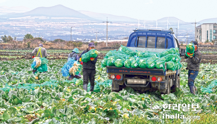 | 제주 농가에서 양배추를 수확하고 있다. 한라일보 DB |