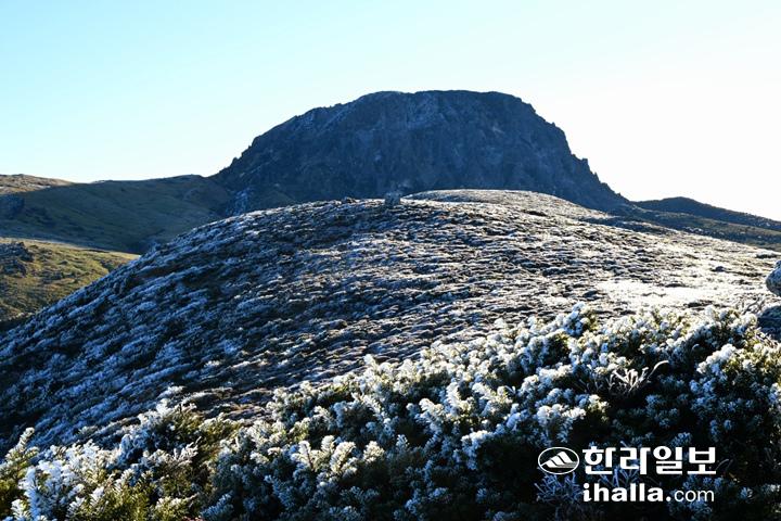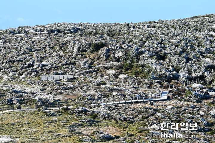 | 찬 공기가 내려오면서 아침 기온이 영하로 떨어진 3일 한라산 높은 산지에 상고대가 활짝 피었다. 강희만 기자 |