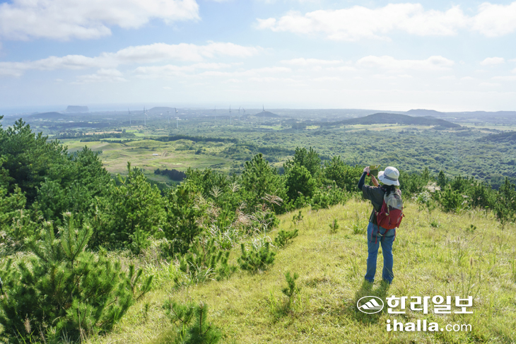 [한라일보] 연휴 내내 찌뿌둥하던 하늘이 환하게 열린 주말. 쾌청한 초가을 날씨를 만끽하며 길을 나섰다. 지난 11일 진행된 '2025 제주섬 글로벌 에코투어'는 옛적 '테우리'가 다니던 길을 따라 초지와 오름, 곶자왈 지대를 누비는 시간이었다. 빈자리 하나 없이 꽉 찬 버스가 어느새 구좌읍 하도 목장에 닿았다.