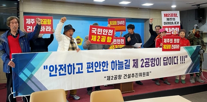 제주제2공항건설추진위원회는 13일 오전 제주도의회 도민카페에서 기자회견을 열고 “제2공항 건설은 제주도민의 교통 편의성과 지역 균형발전을 불러올 것”이라고 주장했다.