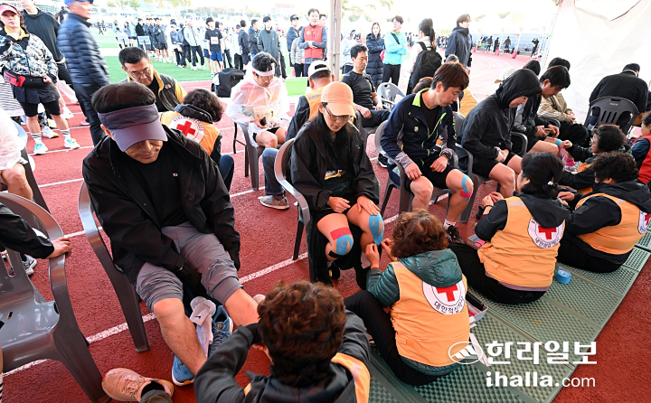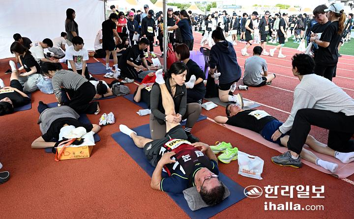 김민주(제주한라대학교 물리치료학과 2학년)씨는 “고관절부터 발목까지 모든 하지 근육을 풀어주고 있다”며 “모든 참여자들이 부상 없이 완주할 수 있기를 바란다”고 했다.