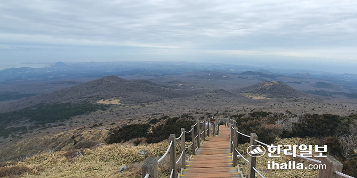 [한라일보] 한라산 영실탐방로의 숲길을 지나면 하늘이 열리면서 시야가 트인다. 숨이 가쁘다. 뒤를 돌아보면 드넓은 숲과 오름과 해안과 바다가 들어온다. 가장 가까이 보이는 오름이 볼레오름이다. 서귀포시 하원동 산1-1다. 표고 1374.2m, 자체 높이 104m다. 이 오름엔 북서쪽으로 크게 벌어진 분화구가 있다. 오름 정상에서 화구바닥에 이르는 사면이 급경사를 이루고 있다. 남서쪽으로는 커다란 계곡이 만들어져 있는데, 특히 정상 부분은 깎아지른 급경사를 이루고 있다. 동쪽 기슭에는 샘이 솟는다.