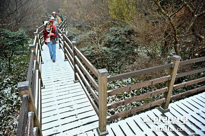 찬 대륙고기압으로 서해 상에서 만들어진 비구름대가 제주지방으로 유입되면서 18일 한라산 1100고지 습지에 첫 눈이 내렸다. 강희만 기자