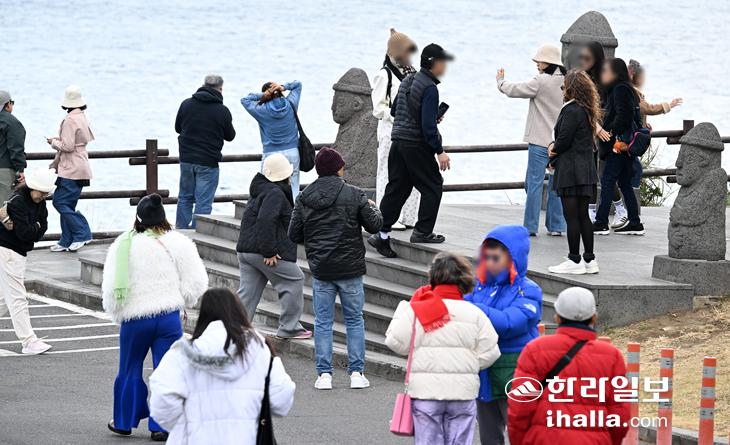 [한라일보] 기온이 뚝 떨어진 18일 서귀포시 대정읍 송악산을 찾은 관광객들이 두꺼운 옷을 입고 탐방에 나서고 있다. 강희만기자