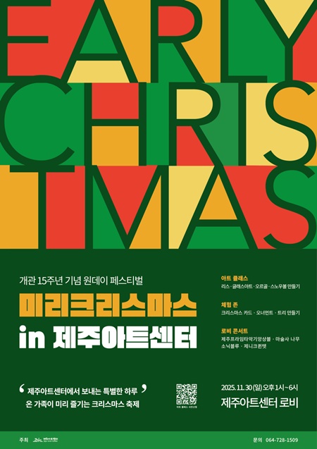 [한라일보] 제주아트센터는 개관 15주년을 기념해 이달 30일 오후 1시부터 6시까지 크리스마스를 테마로 한 원데이 페스티벌 '미리크리스마스 in(인) 제주아트센터'를 연다.