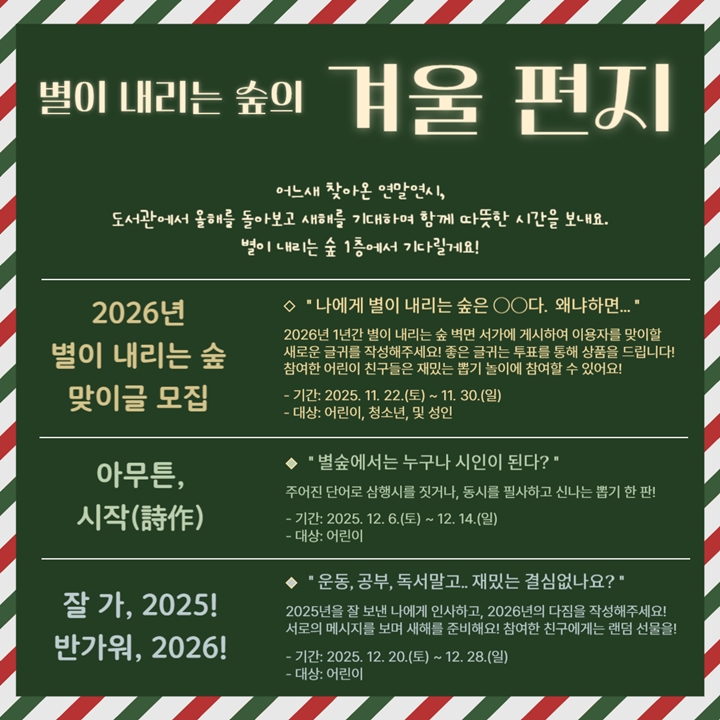 지난 22일부터 오는 30일까지 진행되는 '2026년 별이 내리는 숲 맞이글 모집'은 내년 한 해 도서관 내부 벽면 서가에 게시할 글귀를 공모하는 행사다. 이용자 선호도 투표로 우수작을 선정해 소정의 상품을 증정하며, 어린이들을 위한 뽑기 놀이도 함께 운영한다.