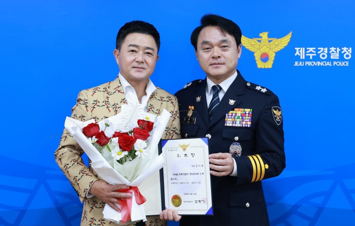제주경찰청 홍보대사에 위촉된 제주 출신 가수 진시몬과 고교 동창생인 고평기 제주경찰청장(오른쪽). 제주경찰청 제공