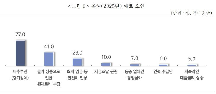 올해 경영 애로 요인(복수응답)으로는 '내수 부진(경기 침체)'이 77%로 가장 많이 지목됐다. 이어 '물가 상승으로 인한 원재료비 부담(41%)', '최저임금 등 인건비 상승(23%)' 순으로 꼽혔다. 내년 예상되는 애로요인 1순위도 '내수 부진(경기 침체)'가 73%로 가장 높았다.
