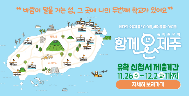 [한라일보] 제주특별자치도교육청이 26일부터 내달 2일까지 '함께온제주 농어촌유학' 2026학년도 1학기 유학생 모집에 나선다. 도시 학생에게 제주 자연·문화를 기반으로 한 특색 교육을 제공하고, 농어촌학교와 지역 공동체를 활성화하기 위한 제주형 상생 교육정책이다.